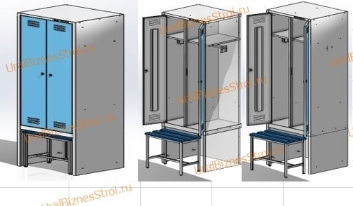 • Шкаф состоит из двух вертикальных секций,с двумя распашными дверями,в нижней части располагается ниша для выдвижной скамьи.