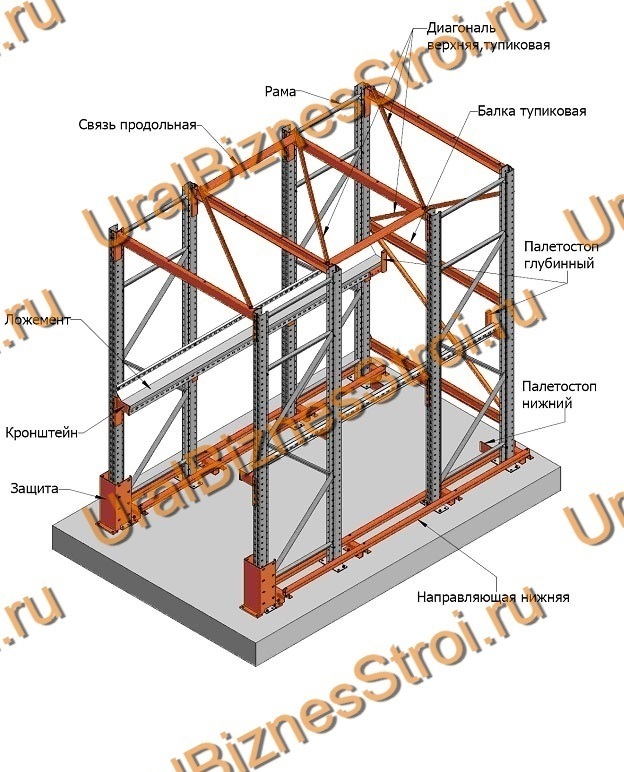 - специальные отбойники и направляющие рельсы по всей глубине стеллажа защищают от повреждений при работе техники.